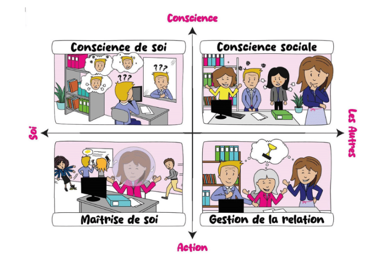 - Les 4 piliers de l’intelligence émotionnelle : conscience à soi / conscience sociale / maitrise de soi / gestion de la relation.
